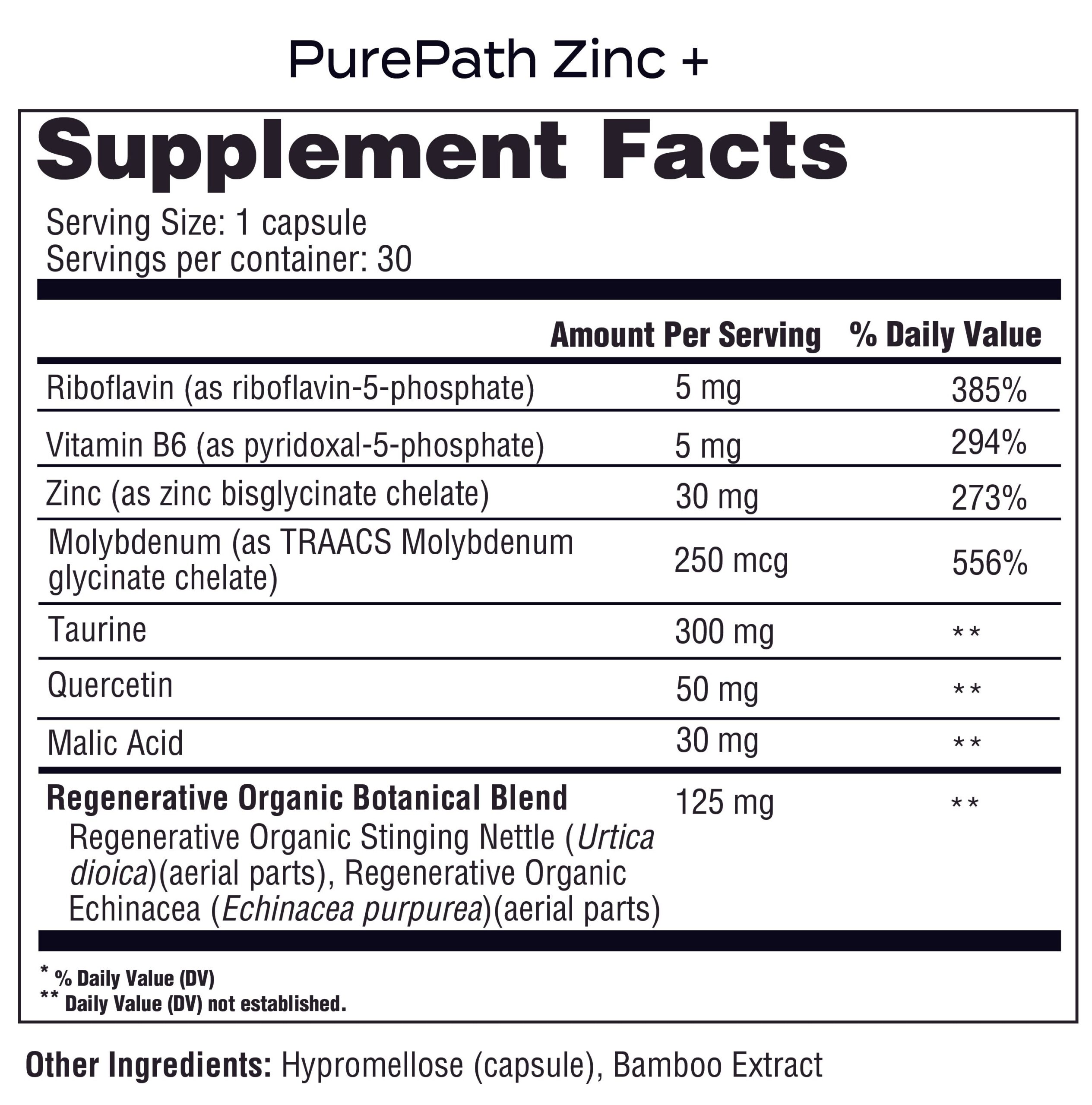 PurePath Zinc+ delivers 30mg of chelated zinc bisglycinate — the most bioavailable and gentle form of zinc — combined with key B-vitamin cofactors and quercetin for a synergistic immune and antioxidant formula. Zinc is an essential trace mineral involved in over 200 enzymatic functions in the body, including immune cell development, testosterone production, wound healing, and antioxidant defense. The addition of quercetin, a natural zinc ionophore, helps facilitate zinc transport into cells where it is most needed. This comprehensive formula supports immune resilience, hormonal balance, and whole-body cellular protection at an accessible price point.*