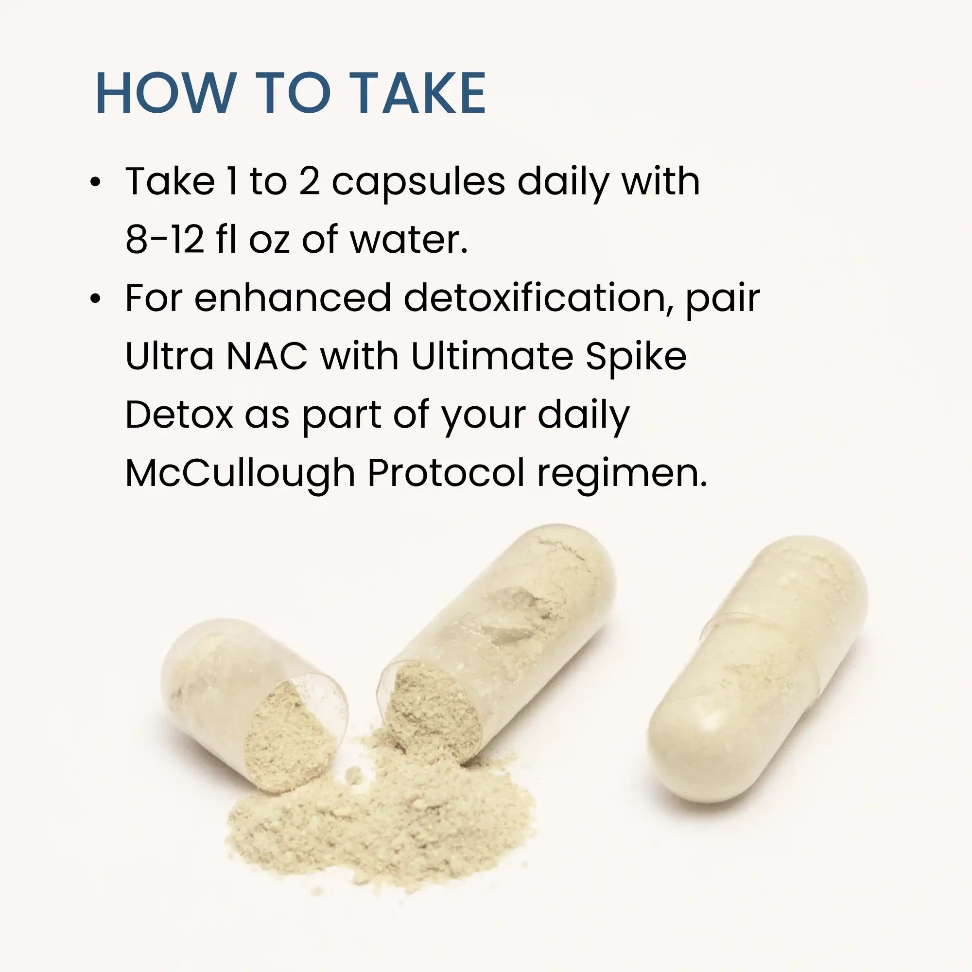 Take as directed on the label, typically 1-2 capsules twice daily with or without food. For acute respiratory support, dosing may be increased as directed by your healthcare provider. NAC is best taken away from metal-containing supplements. Consistent daily use supports sustained glutathione levels and detoxification capacity.